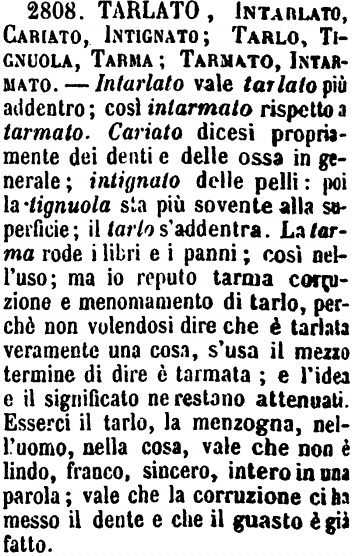 | Tarlato, Intarlato, Cariato, Intignato; Tarlo, Tignuola, Tarma; Tarmato, Intarmato - Intarlato vale tarlato più addentro; così intarmato rispetto a tarmato. Cariato dicesi propriamente dei denti e delle ossa in generale; intignato delle pelli: poi la tignuola sta più sovente alla superficie; il tarlo s'addentra. La tarma rode i libri e i panni; così nell'uso; ma io reputo tarma corruzione e menomamento di tarlo, perchè non volendosi dire che è tarlata veramente una cosa, s'usa il mezzo termine di dire è tarmata; e l'idea e il significato ne restano attenuati. Esserci il tarlo, la menzogna, nell'uomo, nella cosa, vale che non è lindo, franco, sincero, intero in una parola; vale che la corruzione ci ha messo il dente e che il guasto è già fatto. [immagine] |
