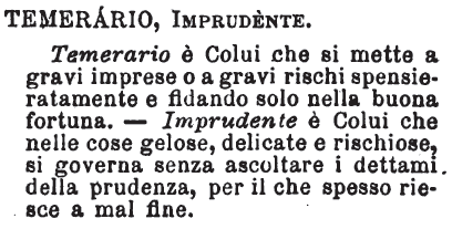 | Temerario, Imprudente - Temerario è Colui che si mette a gravi imprese o a gravi rischi spensieratamente e fidando solo nella buona fortuna. - Imprudente è Colui che nelle cose gelose, dedicate e rischiose, si governa senza ascoltare i dettami della prudenza, per il che spesso riesce a mal fine. [immagine] |