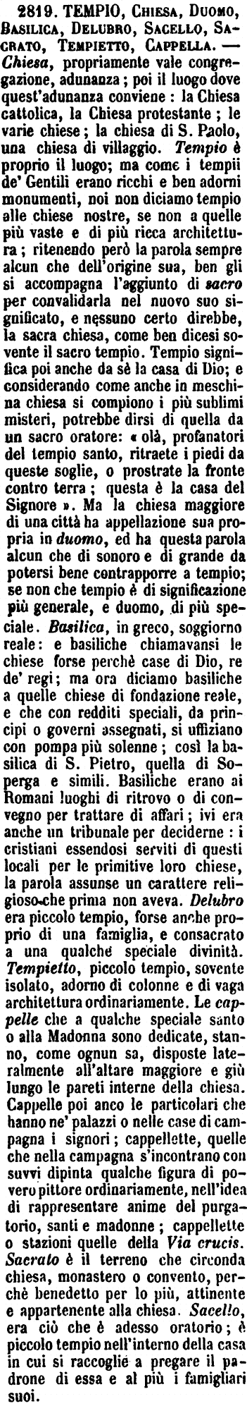 | Tempio, Chiesa, Duomo, Basilica, Delubro, Sacello, Sagrato, Tempietto, Cappella - Chiesa, propriamente vale congregazione, adunanza; poi il luogo dove quest'adunanza conviene: la Chiesa cattolica, la Chiesa protestante; le varie chiese; la chiesa di S. Paolo, una chiesa di villaggio. Tempio è proprio il luogo; ma come i tempii de' Gentili erano ricchi e ben adorni monumenti, noi non diciamo tempio alle chiese nostre, se non a quelle più vaste e di più ricca architettura; ritenendo però la parola sempre alcun che dell'origine sua, ben gli si accompagna l'aggiunto di sacro per convalidarla nel nuovo suo significato, e nessuno certo direbbe, la sacra chiesa, come ben dicesi sovente il sacro tempio. Tempio significa poi anche da sè la casa di Dio; e considerando come anche in meschina chiesa si compiono i più sublimi misteri, potrebbe dirsi di quella da un sacro oratore: « olà, profanatori del tempio santo, ritraete i piedi da queste soglie, o prostrate la fronte contro terra; questa è la casa del Signore ». Ma la chiesa maggiore di una città ha appellazione sua propria in duomo, ed ha questa parola alcun che di sonoro e di grande da potersi bene contrapporre a tempio; se non che tempio è di significazione più generale, e duomo, di più speciale. Basilica, in greco, soggiorno reale: e basiliche chiamavansi le chiese forse perchè case di Dio, re de' regi; ma ora diciamo basiliche a quelle chiese di fondazione reale, e che con redditi speciali, da principi o governi assegnati, si uffiziano con pompa più solenne; così la basilica di S. Pietro, quella di Soperga e simili. Basiliche erano ai Romani luoghi di ritrovo o di convegno per trattare di affari; ivi era anche un tribunale per deciderne: i cristiani essendosi serviti di questi locali per le primitive loro chiese, la parola assunse un carattere religioso che prima non aveva. Delubro era piccolo tempio, forse anche proprio di una famiglia, e consacrato a una qualche speciale divinità. Tempietto, piccolo tempio, sovente isolato, adorno di colonne e di vaga architettura ordinariamente. Le cappelle che a qualche speciale santo o alla Madonna sono dedicate, stanno, come ognun sa, disposte lateralmente all'altare maggiore e giù lungo le pareti interne della chiesa. Cappelle poi anco le particolari che hanno ne' palazzi o nelle case di campagna i signori; cappellette, quelle che nella campagna s'incontrano con suvvi dipinta qualche figura di povero pittore ordinariamente, nell'idea di rappresentare anime del purgatorio, santi e madonne; cappellette o stazioni quelle della Via crucis. Sacrato è il terreno che circonda chiesa, monastero o convento, perchè benedetto per lo più, attinente e appartenente alla chiesa. Sacello, era ciò che è adesso oratorio; è piccolo tempio nell'interno della casa in cui si raccoglie a pregare il padrone di essa e al più i famigliari suoi. [immagine] |