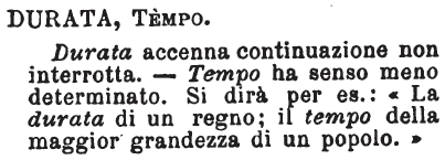 | Durata, Tempo - Durata accenna continuazione non interrotta. - Tempo ha senso meno determinato. Si dirà per es. : «La durata di un regno; il tempo della maggior grandezza di un popolo.» [immagine] |
