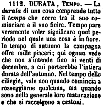 | Durata, Tempo - La durata di un cosa comprende tutto il tempo che corre tra il suo cominciare e il suo finire. Tempo pare veramente voler significare quel periodo nel quale una cosa è in fiore. In tempo di autunno la campagna offre mille piaceri; qui ognun vede che non s'intende fino ai venti di decembre, a cui porterebbe l'intiera durata dell'autunno. Nel tempo delle ciliegie, vale non quando comincia a rosseggiarne qualcuna, ma quando sono nella generale loro maturazione e che si raccolgono a cestoni. [immagine] |