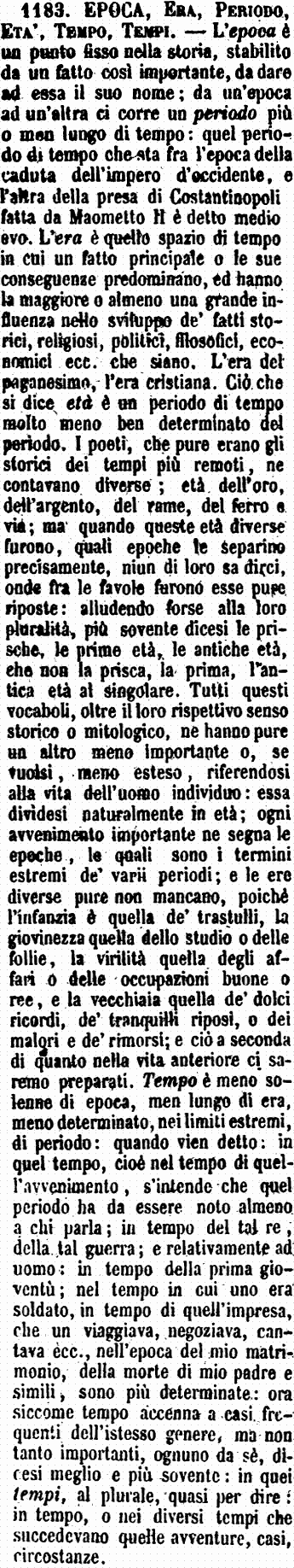 | Epoca, Tempo, Era - Epoca è propriamente momento storico memorabile, che distingue i tempi; e si pone come punto fisso nella cronologia, per recare a quello i fatti e i casi seguiti; per esempio, la caduta dell'Impero romano e il Diluvio, sono epoche. - Era è avvenimento memorabile a punto fisso, dal quale presso a'varii popoli si cominciano a contare gli anni: L'èra cristiana, L'èra di Maometto. - La voce Tempo è generica. - « Al tempo della dominazione austriaca; » dove non si vede punto fisso; ma solo lo spazio che corre da età a età. [immagine] |