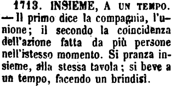 | Insieme, A un tempo - Il primo dice la compagnia, l'unione; il secondo la coincidenza dell'azione fatta da più persone nell'istesso momento. Si pranza insieme, alla stessa tavola; si bene a un tempo, facendo un brindisi. [immagine] |