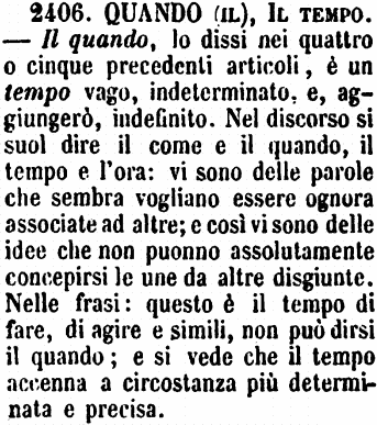 | Quando (il), Il tempo - Il quando, lo dissi nei quattro o cinque precedenti articoli, è un tempo vago, indeterminato, e, aggiungerò, indefinito. Nel discorso si suol dire il come e il quando, il tempo e l'ora: vi sono delle parole che sembra vogliano essere ognora associate ad altre; e così vi sono delle idee che non puonno assolutamente concepirsi le une da altre disgiunte. Nelle frasi: questo è il tempo di fare, di agire e simili, non può dirsi il quando; e si vede che il tempo accenna a circostanza più determinata e precisa. [immagine] |