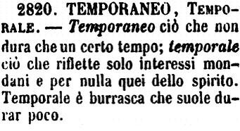 | Temporaneo, Temporale - Temporaneo ciò che non dura che un certo tempo; temporale ciò che riflette solo interessi mondani e per nulla quei dello spirito. Temporale è burrasca che suole durar poco. [immagine] |