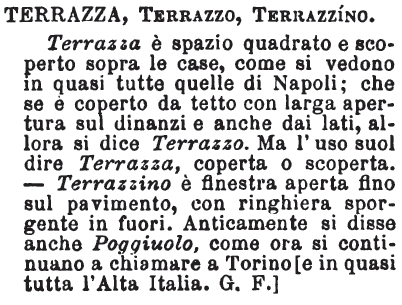 | Terrazza, Terrazzo, Terrazzino - Terrazza è spazio quadrato e scoperto sopra le case, come si vedono in quasi tutte quelle di Napoli; che se è coperto da tetto con larga apertura sul dinanzi e anche dai lati, allora si dice Terrazzo. Ma l'uso suol dire Terrazza, coperta o scoperta. Terrazzino è finestra aperta fino sul pavimento, con ringhiera sporgente in fuori. Anticamente si disse anche Poggiuolo, come ora si continuano a chiamare a Torino[e in quasi tutta l'Alta Italia. G.F.] [immagine] |