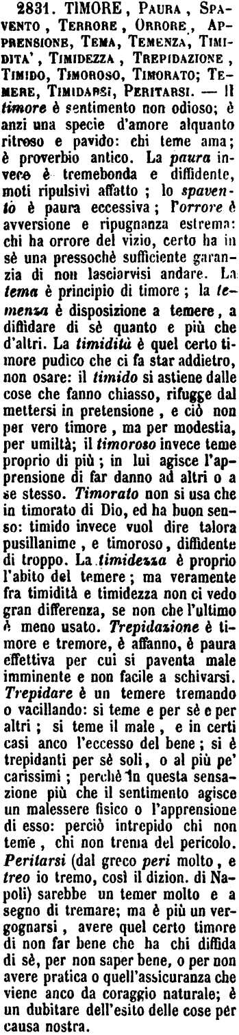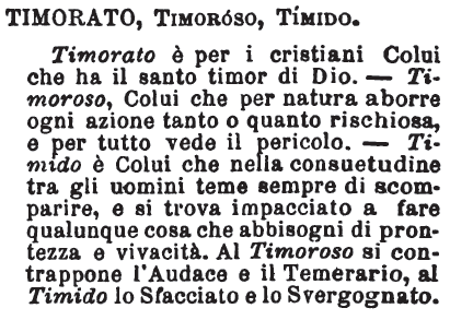 | Timorato, Timoroso, Timido - Timorato è per i cristiani Colui che ha il santo timor di Dio. - Timoroso, Colui che per natura aborre ogni azione tanto o quanto rischiosa, e per tutto vede il pericolo. - Timido è Colui che nella consuetudine tra gli uomini teme sempre di scomparire, e si trova impacciato a fare qualunque cosa che abbisogni di prontezza e vivacità. Al Timoroso si contrappone l'Audace e il Temerario, al Timido lo Sfacciato e lo Svergognato. [immagine] |