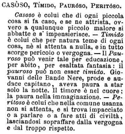 | Casoso, Timido, Pauroso, Peritoso - Casoso è colui che di ogni piccola cosa si fa caso, e se ne attrista, ovvero a qualunque piccolo malore si abbatte e s'impensierisce. - Timido è colui che per natura teme di ogni cosa, nè si attenta a nulla, e in tutto scorge pericolo o vergogna. - Il Pauroso può venir tale per educazione, per abito, per esaltata fantasia: il pauroso può non esser timido. Giovanni delle Bande Nere, prode e audace capitano, aveva paura a star solo la notte. Il timore è nel cuore; la paura nell'immaginazione. - Peritoso è colui che nella comune usanza non si attenta, e si trova impacciato o a parlare o a fare atti di civiltà, lasciandosi sopraffare dalla vergogna e dal troppo rispetto. [immagine] |