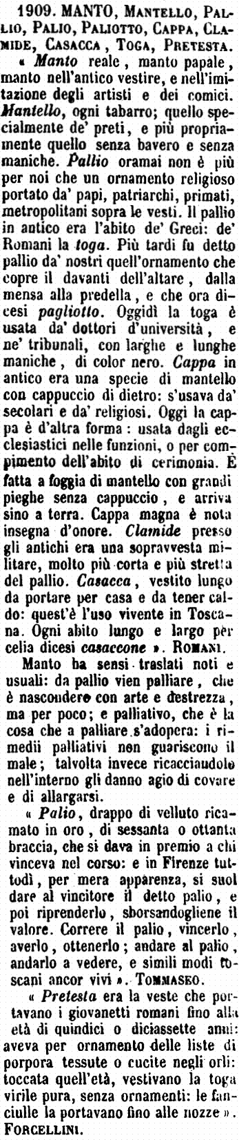| Manto, Mantello, Pallio, Palio, Paliotto, Cappa, Clamide, Casacca, Toga, Pretesta - « Manto reale, manto papale, manto nell'antico vestire, e nell'imitazione degli artisti e dei comici. Mantello, ogni tabarro; quello specialmente de' preti, e più propriamente quello senza bavero e senza maniche. Pallio oramai non è più per noi che un ornamento religioso portato da' papi, patriarchi, primati, metropolitani sopra le vesti. Il pallio in antico era l'abito de' Greci: de' Romani la toga. Più tardi fu detto pallio da' nostri quell'ornamento che copre il davanti dell'altare, dalla mensa alla predella, e che ora dicesi pagliotto. Oggidì la toga è usata da' dottori d'università, e ne' tribunali, con larghe e lunghe maniche, di color nero. Cappa in antico era una specie di mantello con cappuccio di dietro: s'usava da' secolari e da' religiosi. Oggi la cappa è d'altra forma: usata dagli ecclesiastici nelle funzioni, o per compimento dell'abito di cerimonia. È fatta a foggia di mantello con grandi pieghe senza cappuccio, e arriva sino a terra. Cappa magna è nota insegna d'onore. Clamide presso gli antichi era una sopravvesta militare, molto più corta e più stretta del pallio. Casacca, vestito lungo da portare per casa e da tener caldo: quest'è l'uso vivente in Toscana. Ogni abito lungo e largo per celia dicesi casaccone ». Romani.
