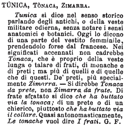 | Tunica, Tonaca, Zimarra - Tunica si dice nel senso storico parlando degli antichi, o della veste militare odierna, senza notare i sensi anatomici e botanici. Oggi lo dicono di una parte del vestito femminile, prendendolo forse dal francese. Nei significati accennati non cadrebbe Tonaca, che è proprio della veste lunga o talare di frati, di monache e di preti; ma più di quelli e di quelle che di questi.De' preti, più specialmente Zimarra. - Si direbbe Tonaca da prete, non Zimarra da frate. Di frate sfratato si dice che ha buttato via la tonaca; di un prete o di un chierico, piuttosto che ha buttato via il collare. Quasi antonomasticamente, Le tonache vuol dire I frati. G. F. [immagine] |