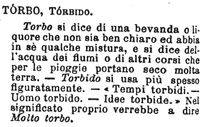 | Torbo, Torbido - Torbo si dice di una bevanda o liquore che non sia ben chiaro ed abbia in sè qualche mistura, e si dice dell'acqua dei fiumi o di altri corsi che per le pioggie portano seco molta terra. - Torbido si usa più spesso figuratamente. - « Tempi torbidi. - Uomo torbido. - Idee torbide.» Nel significato proprio verrebbe a dire Molto torbo. [immagine] |