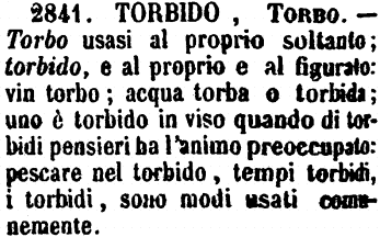 | Torbido, Torbo - Torbo usasi al proprio soltanto; torbido, e al proprio e al figurato: vin torbo; acqua torba o torbida; uno è torbido in viso quando di torbidi pensieri ha l'animo preoccupato: pescare nel torbido, tempi torbidi, i torbidi, sono modi usati comunemente. [immagine] |