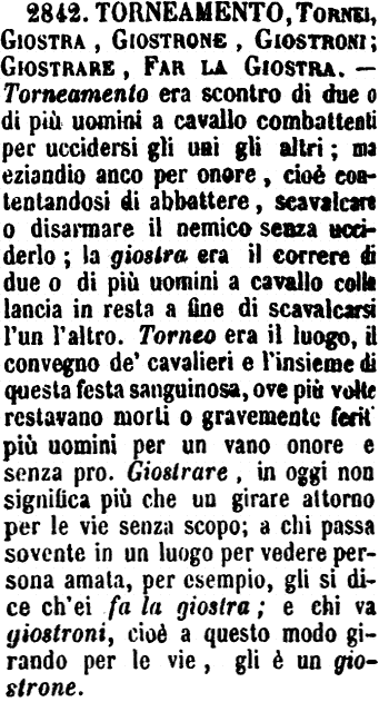 | Torneamento, Tornei, Giostra, Giostrone, Giostroni; Giostrare, Far la giostra - Torneamento era scontro di due o di più uomini a cavallo combattenti per uccidersi gli uni gli altri; ma eziandio anco per onore, cioè contentandosi di abbattere, scavalcare o disarmare il nemico senza ucciderlo; la giostra era il correre di due o di più uomini a cavallo colla lancia in resta a fine di scavalcarsi l'un l'altro. Torneo era il luogo, il convegno de' cavalieri e l'insieme di questa festa sanguinosa, ove più volte restavano morti o gravemente feriti più uomini per un vano onore e senza pro. Giostrare, in oggi non significa più che un girare attorno per le vie senza scopo; a chi passa sovente in un luogo per vedere persona amata, per esempio, gli si dice ch'ei fa la giostra; e chi va giostroni, cioè a questo modo girando per le vie, gli è un giostrone. [immagine] |