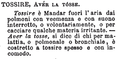 | Tossire, Aver la tosse - Tossire è Mandar fuori l'aria dai polmoni con veemenza e con suono interrotto, o volontariamente, o per cacciare qualche materia irritante. - Aver la tosse, si dice di chi per malattia, o polmonale o bronchiale, è costretto a tossire spesso e con incomodo. [immagine] |