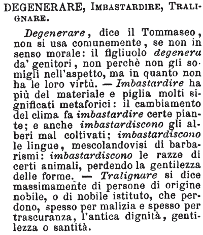 | Degenerare, Imbastardire, Tralignare - Degenerare, dice il Tommaseo, non si usa comunemente, se non in senso morale: il figliuolo degenera da' genitori, non perchè non gli somigli nell'aspetto, ma in quanto non ha le loro virtù. -Imbastardire ha più del materiale e piglia molti significati metaforici: il cambiamento del clima fa imbastardire certe piante; e anche imbastardiscono gli alberi mal coltivati; imbastardiscono le lingue, mescolandovisi di barbarismi: imbastardiscono le razze di certi animali, perdendo la gentilezza delle forme. -Tralignare si dice massimamente di persone di origine nobile, o di nobile istituto, che perdono, spesso per malizia e spesso per trascuranza, l'antica dignità, gentilezza o santità. [immagine] |