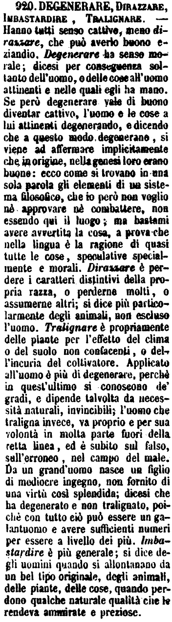 | Degenerare, Dirazzare, Imbastardire, Tralignare - Hanno tutti senso cattivo, meno dirazzare, che può averlo buono eziandio. Degenerare ha senso morale; dicesi per conseguenza soltanto dell'uomo, o delle cose all'uomo attinenti e nelle quali egli ha mano. Se però degenerare vale di buono diventar cattivo, l'uomo e le cose a lui attinenti degenerando, e dicendo che a questo modo degenerano, si viene ad affermare implicitamente che in origine, nella genesi loro erano buone: ecco come si trovano in una sola parola gli elementi di un sistema filosofico, che io però non voglio nè approvare nè combattere, non essendo qui il luogo; ma bastami avere avvertita la cosa, a prova che nella lingua è la ragione di quasi tutte le cose, speculative specialmente e morali. Dirazzare è perdere i caratteri distintivi della propria razza, o perderne molti, o assumerne altri; si dice più particolarmente degli animali, non escluso l'uomo. Tralignare è propriamente delle piante per l'effetto del clima o del suolo non confacenti, o dell'incuria del coltivatore. Applicato all'uomo è più di degenerare, perchè in quest'ultimo si conoscono de' gradi, e dipende talvolta da necessità naturali, invincibili; l'uomo che traligna invece, va proprio e per sua volontà in molta parte fuori della retta linea, ed è subito sul falso, sull'erroneo, nel campo del male. Da un grand'uomo nasce un figlio di mediocre ingegno, non fornito di una virtù così splendida; dicesi che ha degenerato e non tralignato, poichè con tutto ciò può essere un galantuomo e avere sufficienti numeri per essere a livello dei più. Imbastardire è più generale; si dice degli uomini quando si allontanano da un bel tipo originale, degli animali, delle piante, delle cose, quando perdono qualche naturale qualità che le rendeva ammirate e preziose. [immagine] |