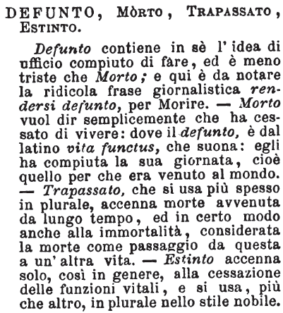 | Defunto, Morto, Trapassato, Estinto - Defunto contiene in sè l'idea di ufficio compiuto di fare, ed è meno triste che Morto; e qui è da notare la ridicola frase giornalistica rendersi defunto, per Morire. - Morto vuol dire semplicemente che ha cessato di vivere: dove il defunto, è dal latino vita functus, che suona: egli ha compiuta la sua giornata, cioè quello per che era venuto al mondo. - Trapassato, che si usa più spesso in plurale, accenna morte avvenuta da lungo tempo, ed in certo modo anche alla immortalità, considerata la morte come passaggio da questa a un'altra vita. - Estinto accenna solo, così in genere, alla cessazione delle funzioni vitali, e si usa, più che altro, in plurale nello stile nobile. [immagine] |