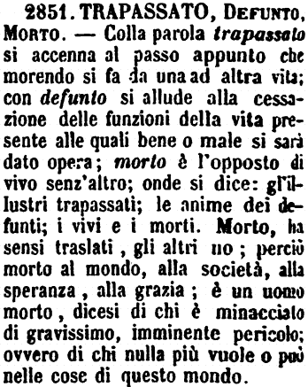| Trapassato, Defunto, Morto - Colla parola trapassato si accenna al passo appunto che morendo si fa da una ad altra vita; con defunto si allude alla cessazione delle funzioni della vita presente alle quali bene o male si sarà dato opera; morto è l'opposto di vivo senz'altro; onde si dice: gl'illustri trapassati; le anime dei defunti; i vivi e i morti. Morto, ha sensi traslati, gli altri no; perciò morto al mondo, alla società, alla speranza, alla grazia; è un uomo morto, dicesi di chi è minacciato di gravissimo, imminente pericolo; ovvero di chi nulla più vuole o può nelle cose di questo mondo. [immagine] |