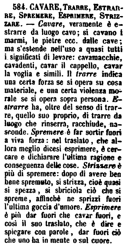 | Cavare, Trarre, Estrarre, Spremere, Esprimere, Strizzare - Cavare, veramente è estrarre da luogo cavo; si cavano i marmi, le pietre ecc. dalle cave; ma s'estende nell'uso a quasi tutti i significati di levare: cavamacchie, cavadenti, cavar il cappello, cavar la voglia e simili. Il trarre indica una certa forza se si opera su cosa materiale, e una certa violenza morale se si opera sopra persona. Estrarre ha, oltre del senso di trarre, quello suo proprio, di trarre da luogo che rinserra, racchiude, nasconde. Spremere è far sortir fuori a viva forza: nel traslato, che allora meglio dicesi esprimere, è cercare e dichiarare l'ultima ragione e conseguenza delle cose. Strizzare è più di spremere: dopo di aver ben bene spremuto, si strizza, cioè quasi si spezza, si sbriciola ciò che si spreme, affinchè ne sprizzi fuori l'ultima goccia d'umore. Esprimere è più dar fuori che cavar fuori, e così il suo traslato, che è dire e spiegare con parole, dar fuori ciò che uno ha in mente o sul cuore. [immagine] |