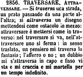 | Traversare, Attraversare - Si traversa una strada, un prato passando da una parte all'altra; si attraversa un disegno mettendosi come ostacolo in mezzo: attraversare è mettersi come in traverso: nel traversare si va, nell'attraversare uno si ferma: in senso traslato, un pensiero mi traversa la fantasia; l'afferro o no; un dubbio mi s'attraversa in capo e fisso vi sta e mi cruccia e mi martella per un tempo indefinito. [immagine] |