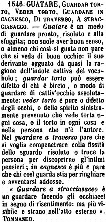 | Guatare, Guardar torto, Veder torto, Guardare in cagnesco, Di traverso, A stracciasacco - Guatare è un modo di guardare pronto, risoluto e alla sfuggita; non suole aver buon senso, o almeno chi così si guata non pare che si veda di buon occhio: il suo derivante agguato dà quasi la ragione dell'indole cattiva del vocabolo; guardar torto può essere difetto di chi è bircio, o modo di guardare di cattiv'occhio assolutamente: veder torto è pure o difetto degli occhi, o dello spirito sinistramente prevenuto che vede torta ogni cosa, o il torto in ogni cosa e nella persona che n'è l'autore. Nel guardare a traverso pare che si voglia compenetrare colla fissità dello sguardo risoluto o truce la persona per discoprirne gl'intimi pensieri; in cagnesco è più e pare che chi così guarda stia per ringhiare e avventarsi addosso.