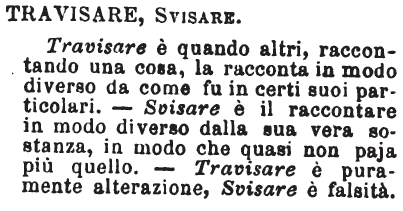 | Travisare, Svisare - Travisare è quando altri, raccontando una cosa, la racconta in modo diverso da come fu in certi suoi particolari. - Svisare è il raccontare in modo diverso dalla sua vera sostanza, in modo che quasi non paja più quello. - Travisare è puramente alterazione, Svisare è falsità. [immagine] |