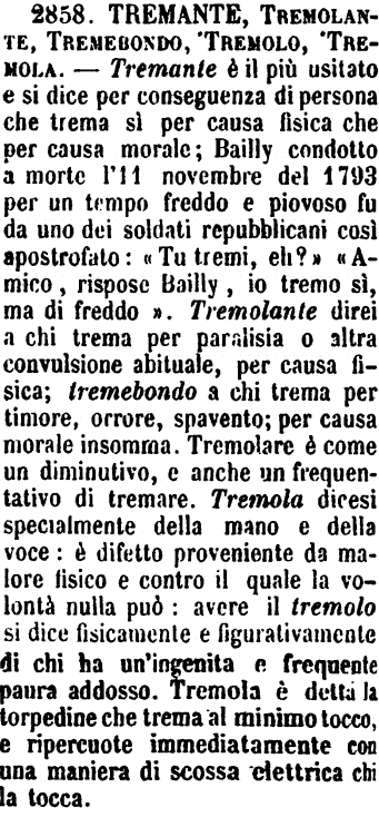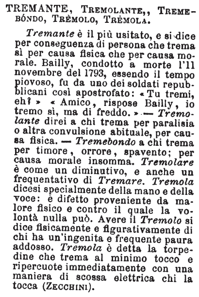 | Tremante, Tremolante, Tremebondo, Tremolo, Tremola - Tremante è il più usitato, e si dice per conseguenza di persona che trema sì per causa fisica che per causa morale. Bailly, condotto a morte l'11 novembre del 1793, essendo il tempo piovoso, fu da uno dei soldati repubblicani così apostrofato: «Tu tremi, eh?» «Amico, rispose Bailly, io tremo sì, ma di freddo.» - Tremolante direi a chi trema per paralisia o altra convulsione abituale, per causa fisica. - Tremebondo a chi trema per timore, orrore, spavento; per causa morale insomma. Tremolare è come un diminutivo, e anche un frequentativo di Tremare. Tremola dicesi specialmente della mano e della voce: è difetto proveniente da malore fisico e contro il quale la volontà nulla può. Avere il Tremolo si dice fisicamente e figurativamente di chi ha un'ingenita e frequente paura addosso. Tremola è detta la torpedine che trema al minimo tocco e ripercuote immediatamente con una maniera di scossa elettrica chi la tocca (Zecchini). [immagine] |