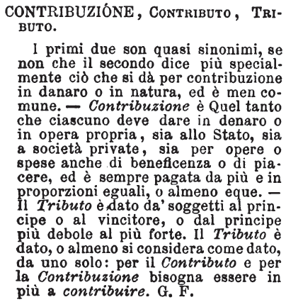 | Contribuzione, Contributo, Tributo - I primi due son quasi sinonimi, se non che il secondo dice più specialmente ciò che si dà per contribuzione in danaro o in natura, ed è men comune. - Contribuzione è Quel tanto che ciascuno deve dare in denaro o in opera propria, sia allo Stato, sia a società private, sia per opere o spese anche di beneficenza o di piacere, ed è sempre pagata da più e in proporzioni eguali, o almeno eque. - Il Tributo è dato da' soggetti al principe o al vincitore, o dal principe più debole al più forte. Il Tributo è dato, o almeno si considera come dato, da uno solo: per il Contributo e per la Contribuzione bisogna essere in più a contribuire. G. F. [immagine] |