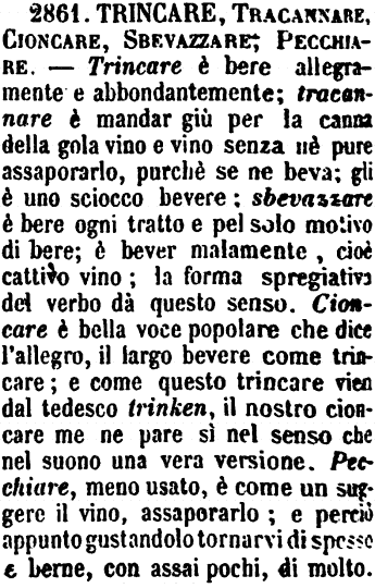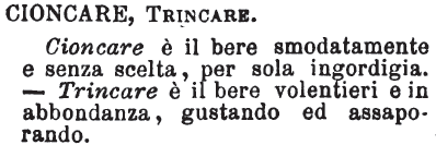 | Cioncare, Trincare - Cioncare è il bere smodatamente e senza scelta, per sola ingordigia. — Trincare è il bere volentieri e in abbondanza, gustando ed assaporando. [immagine] |