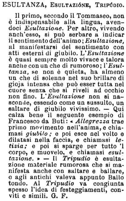 | Esultanza, Esultazione, Tripudio - Il primo, secondo il Tommaseo, non è indispensabile alla lingua, avendoci Esultazione. Per altro, vivendo anch'esso, si può serbare a indicar il sentimento dell'animo; Esultazione, al manifestarsi del sentimento con atti esterni di giubilo. L'Esultazione è quasi sempre molto vivace e talora anche con un che di rumoroso; l'Esultanza, se non è quieta, ha almeno un che di solenne nel suo brillare di gioja intensa che può essere tutta nel cuore senza che si riveli ad occhio non fino. L'Esultazione non si nasconde, essendo come un sussulto, un saltare di giubilo vivissimo. - Qui calza bene il seguente esempio di Francesco da Buti: «Allegrezza trae primo movimento nell'anima, e chiamasi giubilo; e poi esce nel volto e dilatasi nella faccia, e chiamasi letizia; e poi si sparge per tutto 'l corpo, e muovelo, e chiamasi esultazione.» - Il Tripudio è esultazione materiale rumorosa che si manifesta anche con saltare e ballare, e agli antichi valeva appunto Ballo tondo. Al Tripudio va congiunta spesso l'idea di festeggiamenti, conviti e simili. G.F. [immagine] |