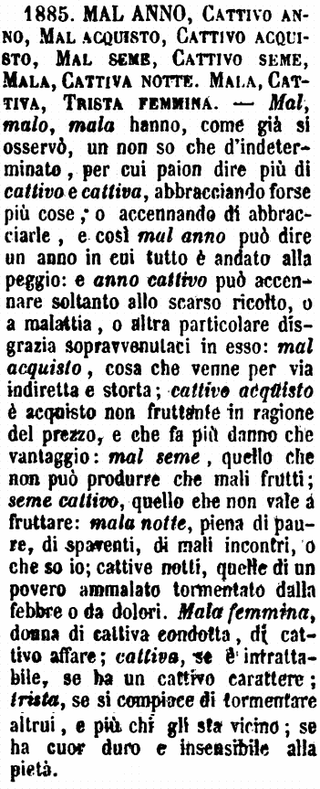| Mal anno, Cattivo anno, Mal acquisto, Cattivo acquisto, Mal seme, Cattivo seme, Mala, Cattiva notte; Mala, Cattiva, Trista femmina - Mal, malo, mala hanno, come già si osservò, un non so che d'indeterminato, per cui paion dire più di cattivo e cattiva, abbracciando forse più cose; o accennando di abbracciarle, e così mal anno può dire un anno in cui tutto è andato alla peggio: e anno cattivo può accennare soltanto allo scarso ricolto, o a malattia, o altra particolare disgrazia sopravvenutaci in esso: mal acquisto, cosa che venne per via indiretta e storta; cattivo acquisto è acquisto non fruttante in ragione del prezzo, e che fa più danno che vantaggio: mal seme, quello che non può produrre che mali frutti; seme cattivo, quello che non vale a fruttare: mala notte, piena di paure, di spaventi, di mali incontri, o che so io; cattive notti, quelle di un povero ammalato tormentato dalla febbre o da dolori. Mala femmina, donna di cattiva condotta, di cattivo affare; cattiva, se è intrattabile, se ha un cattivo carattere; trista, se si compiace di tormentare altrui, e più chi gli sta vicino; se ha cuor duro e insensibile alla pietà. [immagine] |