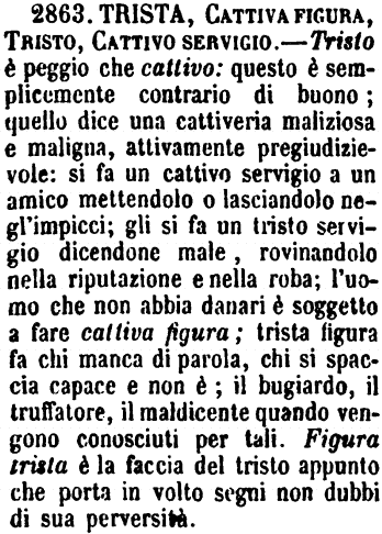 | Trista, Cattiva figura, Tristo, Cattivo servigio - Tristo è peggio che cattivo: questo è semplicemente contrario di buono; quello dice una cattiveria maliziosa e maligna, attivamente pregiudizievole: si fa un cattivo servigio a un amico mettendolo o lasciandolo negl'impicci; gli si fa un tristo servigio dicendone male, rovinandolo nella riputazione e nella roba; l'uomo che non abbia danari è soggetto a fare cattiva figura; trista figura fa chi manca di parola, chi si spaccia capace e non è; il bugiardo, il truffatore, il maldicente quando vengono conosciuti per tali. Figura trista è la faccia del tristo appunto che porta in volto segni non dubbi di sua perversità. [immagine] |