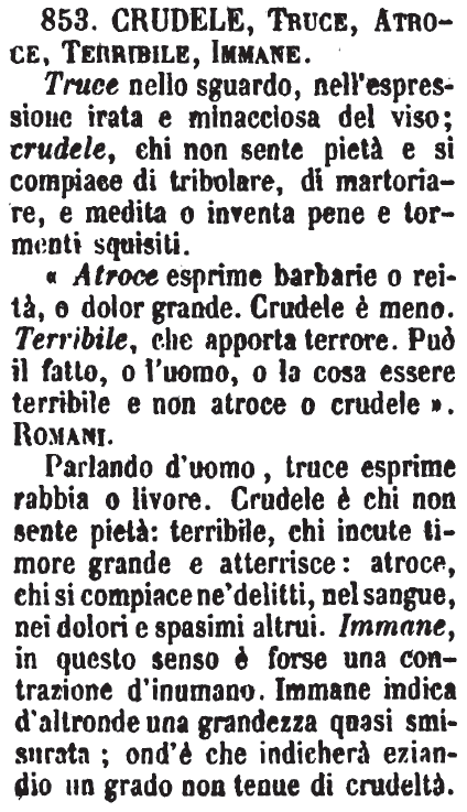 « Atroce esprime barbarie o reità, o dolor grande. Crudele è meno. Terribile, che apporta terrore. Può il fatto, o l'uomo, o la cosa essere terribile e non atroce o crudele ». Romani. Parlando d'uomo, truce esprime rabbia o livore. Crudele è chi non sente pietà: terribile, chi incute timore grande e atterrisce: atroce, chi si compiace ne' delitti, nel sangue, nei dolori e spasimi altrui. Immane, in questo senso è forse una contrazione d'inumano. Immane indica d'altronde una grandezza quasi smisurata; ond'è che indicherà eziandio un grado non tenue di crudeltà. [immagine] |