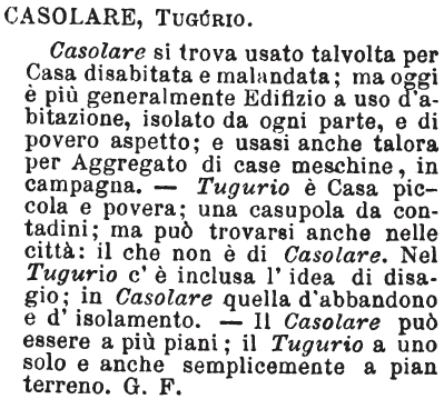| Casolare, Tugurio - Casolare si trova usato talvolta per Casa disabitata e malandata; ma oggi è più generalmente Edifizio a uso d'abitazione, isolato da ogni parte, e di povero aspetto; e usasi anche talora per Aggregato di case meschine, in campagna. - Tugurio è Casa piccola e povera; una casupola da contadini; ma può trovarsi anche nelle città: il che non è di Casolare. Nel Tugurio c'è inclusa l'idea di disagio; in Casolare quella d'abbandono e d'isolamento. - Il Casolare può essere a più piani; il Tugurio a uno solo e anche semplicemente a pian terreno. G. F. [immagine] |