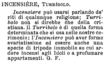 | Incensiere, Turribolo - Incensiere può usarsi parlando de' riti di qualunque religione; Turribolo non si direbbe che della cristiana. Il Turribolo è di quella forma determinata che si usa nelle nostre cerimonie; l'Incensiere può aver forme svariatissime ed essere anche una specie di tripode immobile su cui ardere incensi agli Idoli o a profumare appartamenti. G. F. [immagine] |