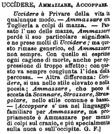 | Uccidere, Ammazzare, Accoppare - Uccidere è Privare della vita in qualunque modo. - Ammazzare era Toglierla a colpi di mazza. - Passato l'uso delle mazze, Ammazzare perdè il suo particolare significato, e ne prese molti di Uccidere; ma questo rimase generico, ed Ammazzare non sempre. Con quello si esprime ogni cagione di morte, anche per oppressione di troppo affetto: con questo va sempre congiunta l'idea della percossa. - Altra differenza: Uccidere, si usa nello stile elevato e nella poesia; Ammazzare, che poco si scosta da Scannare, Strozzare, Strangolare, nello stile comune e basso. - [Accoppare s'usa nel linguaggio familiare per Ammazzare, ma propriamente è Ammazzare per mezzo di colpi sul cranio, e più specialmente sulla nuca o sull'occipite. G. F.] [immagine] |