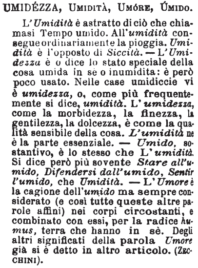 | Umidezza, Umidità, Umore, Umido - L'Umidità è astratto di ciò che chiamasi Tempo umido. All'umidità consegue ordinariamente la pioggia. Umidità è l'opposto di Siccità. - L'Umidezza è o dice lo stato speciale della cosa umida in sè o inumidita: è però poco usato. Nelle case umidiccie vi è umidezza, o, come più frequentemente si dice, umidità. L'umidezza, come la morbidezza, la finezza, la gentilezza, la dolcezza, è come la qualità sensibile della cosa. L'umidità ne è la parte essenziale. - Umido, sostantivo, è lo stesso che L'umidità. Si dice però più sovente Stare all'umido, Difendersi dall'umido, Sentir l'umido, che Umidità. - L'Umore è la cagione dell'umido ma sempre considerato (e così tutte queste altre parole affini) nei corpi circostanti, e combinato con essi, per la radice humus, terra che hanno in sé. Degli altri significati della parola Umore già si è detto in altro articolo. (Zecchini). [immagine] |