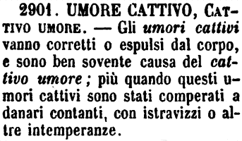 | Umore cattivo, Cattivo umore - Gli umori cattivi vanno corretti o espulsi dal corpo, e sono ben sovente causa del cattivo umore; più quando questi umori cattivi sono stati comperati a danari contanti, con istravizzi o altre intemperanze. [immagine] |