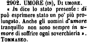 | Umore (in), Di umore - «In dice lo stato presente: di può esprimere stato un po' più prolungato. Anche gli uomini d'umore tranquillo non sono sempre in umore di soffrire ogni soverchieria». Tommaseo. [immagine] |