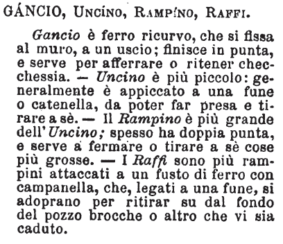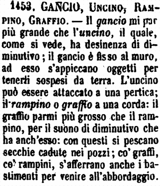 | Gancio, Uncino, Rampino, Graffio - Il gancio mi par più grande che l'uncino, il quale, come si vede, ha desinenza di diminutivo; il gancio è fisso al muro, ad esso s'appiccano oggetti per tenerli sospesi da terra. L'uncino può essere attaccato a una pertica; il rampino o graffio a una corda: il graffio parmi più grosso che il rampino, per il suono di diminutivo che ha anch'esso: con questi si pescano secchie cadute nei pozzi; co' graffi, co' rampini, s'afferrano anche i bastimenti per venire all'abbordaggio. [immagine] |
