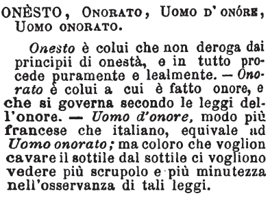 | Onesto, Onorato, Uomo d’onore, Uomo onorato - Onesto è colui che non deroga dai principii di onestà, e in tutto procede puramente e lealmente. - Onorato è colui a cui è fatto onore, e che si governa secondo le leggi dell'onore. - Uomo d'onore, modo più francese che italiano, equivale ad Uomo onorato; ma coloro che voglion cavare il sottile dal sottile ci vogliono vedere più scrupolo e più minutezza nell'osservanza di tali leggi. [immagine] |