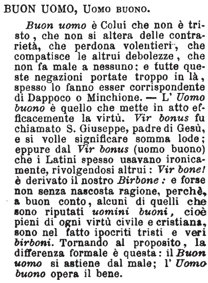 | Buon uomo, Uomo buono - Buon uomo è Colui che non è tristo, che non si altera delle contrarietà, che perdona volentieri, che compatisce le altrui debolezze, che non fa male a nessuno; e tutte queste negazioni portate troppo in là, spesso lo fanno esser corrispondente di Dappoco o Minchione. - L'Uomo buono è quello che mette in atto efficacemente la virtù. Vir bonus fu chiamato S.Giuseppe, padre di Gesù, e si volle significare somma lode; eppure dal Vir bonus (uomo buono) che i Latini spesso usavano ironicamente, rivolgendosi altrui: Vir bone! è derivato il nostro Birbone: e forse non senza nascosta ragione, perchè, a buon conto, alcuni di quelli che sono riputati uomini buoni, cioè pieni di ogni virtù civile e cristiana, sono nel fatto ipocriti tristi e veri birboni. Tornando al proposito, la differenza formale è questa: il Buon uomo si astiene dal male; l'Uomo buono opera il bene. [immagine] |