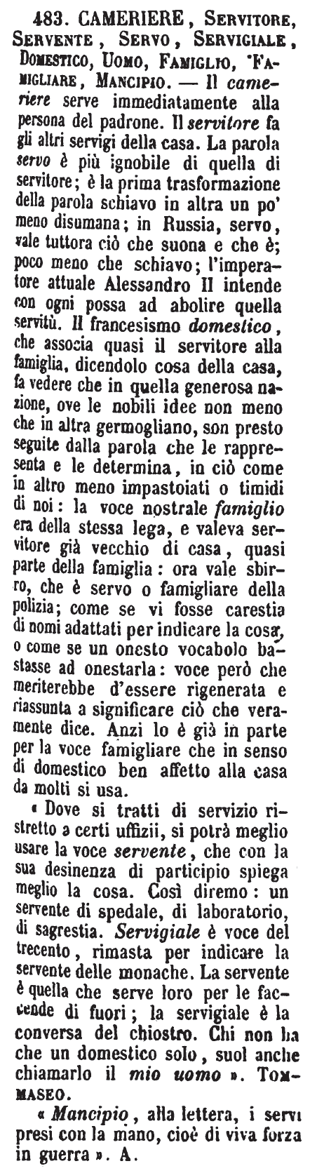 Cameriere, Servitore, Servente, Servo, Servigiale, Domestico, Uomo, Famiglio, Famigliare, Mancipio - Il cameriere serve immediatamente alla persona del padrone. Il servitore fa gli altri servigi della casa. La parola servo è più ignobile di quella di servitore; è la prima trasformazione della parola schiavo in altra un po' meno disumana: in Russia, servo, vale tuttora ciò che suona e che è; poco meno che schiavo; l'imperatore attuale Alessandro II intende con ogni possa ad abolire quella servitù. Il francesismo domestico, che associa quasi il servitore alla famiglia, dicendolo cosa della casa, fa vedere che in quella generosa nazione, ove le nobili idee non meno che in altra germogliano, son presto seguite dalla parola che le rappresenta e le determina, in ciò come in altro meno impastoiati o timidi di noi: la voce nostrale famiglio era della stessa lega, e valeva servitore già vecchio di casa, quasi parte della famiglia: ora vale sbirro, che è servo o famigliare della polizia; come se vi fosse carestia di nomi adattati per indicare la cosa, o come se un onesto vocabolo bastasse ad onestarla: voce però che meriterebbe d'essere rigenerata e riassunta a significare ciò che veramente dice. Anzi lo è già in parte per la voce famigliare che in senso di domestico ben affetto alla casa da molti si usa.