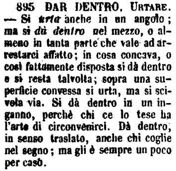 | Dar dentro, Urtare - Si urta anche in un angolo; ma si dà dentro nel mezzo, o almeno in tanta parte che vale ad arrestarci affatto; in cosa concava, o così fattamente disposta si dà dentro e si resta talvolta; sopra una superficie convessa si urta, ma si scivola via. Si dà dentro in un inganno, perchè chi ce lo tese ha l'arte di circonvenirci. Dà dentro, in senso traslato, anche chi coglie nel segno; ma gli è sempre un poco per caso. [immagine] |