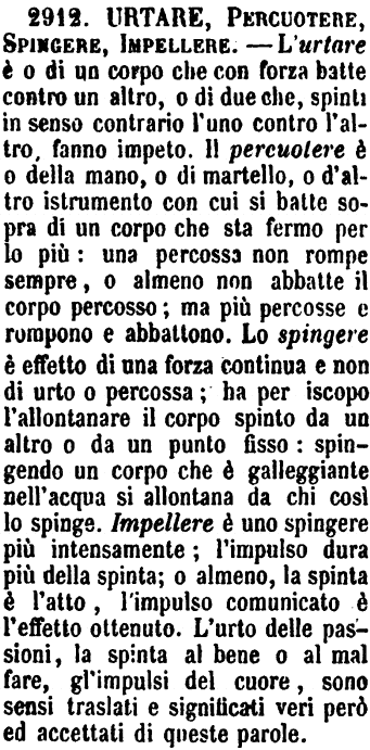 | Urtare, Percuotere, Spingere, Impellere - L'urtare è o di un corpo che con forza batte contro un altro, o di due che, spinti in senso contrario l'uno contro l'altro, fanno impeto. Il percuotere è o della mano, o di martello, o d'altro istrumento con cui si batte sopra di un corpo che sta fermo per lo più: una percossa non rompe sempre, o almeno non abbatte il corpo percosso; ma più percosse e rompono e abbattono. Lo spingere è effetto di una forza continua e non di urto o percossa; ha per iscopo l'allontanare il corpo spinto da un altro o da un punto fisso: spingendo un corpo che è galleggiante nell'acqua si allontana da chi così lo spinge. Impellere è uno spingere più intensamente; l'impulso dura più della spinta; o almeno, la spinta è l'atto, l'impulso comunicato è l'effetto ottenuto. L'urto delle passioni, la spinta al bene o al mal fare, gl'impulsi del cuore, sono sensi traslati e significati veri però ed accettati di queste parole. [immagine] |