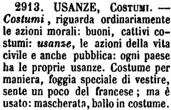 Usanze, Costumi - Costumi, riguarda ordinariamente le azioni morali: buoni, cattivi costumi: usanze, le azioni della vita civile e anche pubblica: ogni paese ha le proprie usanze. Costume per maniera, foggia speciale di vestire, sente un poco del francese; ma è usato: mascherata, ballo in costume. [immagine]