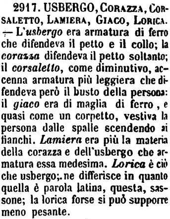 | Usbergo, Corazza, Corsaletto, Lamiera, Giaco, Lorica - L'usbergo era armatura di ferro che difendeva il petto e il collo; la corazza difendeva il petto soltanto; il corsaletto, come diminuitivo, accenna armatura più leggiera che difendeva però il busto della persona: il giaco era di maglia di ferro, e quasi come un corpetto, vestiva la persona dalle spalle scendendo ai fianchi. Lamiera era più la materia della corazza e dell'usbergo che armatura essa medesima. Lorica è ciò che usbergo; ne differisce in quanto quella è parola latina, questa, sassone; la lorica forse si può supporre meno pesante. [immagine] |