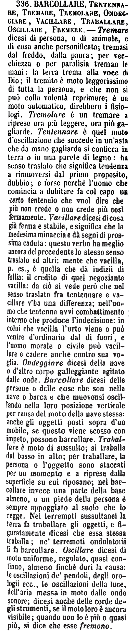 Barcollare, Tentennare, Tremare, Tremolare, Ondeggiare, Vacillare, Traballare, Oscillare, Fremere - Tremare dicesi di persona, o di animale, e di cosa anche personificata; tremasi dal freddo, dalla paura; per vecchiezza o per paralisia treman le mani: la terra trema alla voce di Dio; il tremito è moto leggerissimo di tutta la persona, e che non si può colla volontà reprimere; è un moto automatico, direbbero i fisiologi. Tremolare è un tremare a riprese ora più leggere, ora più gagliarde. Tentennare è quel moto d'oscillazione che succede in un'asta che da mano gagliarda si conficca in terra o in una parete di legno: ha senso traslato che significa tendenza a rimuoversi dal primo proposito, dubbio; e forse perchè l'uomo che comincia a dubitare fa col capo un certo tentennìo che vuol dire che più non crede o non crede più così fermamente. Vacillare dicesi di cosa già ferma e stabile, e significa che la medesima minaccia e dà segni di prossima caduta: questo verbo ha meglio ancora del precedente lo stesso senso traslato ed altri: mente che vacilla, p. es., è quella che dà indizii di follia: il credito di quel negoziante vacilla: da ciò si vede però che nel senso traslato fra tentennare e vacillare v'ha una differenza; nell'uomo che tentenna avvi combattimento interno che produce l'indecisione: in colui che vacilla l'urto viene o può venire d'ordinario dal di fuori, e l'uomo morale o civile può vacillare e cadere anche contro sua voglia. Ondeggiare dicesi della nave o d'altro corpo galleggiante agitato dalle onde. Barcollare dicesi delle persone o delle cose che son nella nave o barca e che muovonsi oscillando nella loro posizione verticale per causa del moto della nave stessa: anche gli oggetti posti sopra d'un mobile, se questo viene scosso con impeto, possono barcollare. Traballare è moto di sussulto; si traballa dal basso in alto; per traballare, la persona o l'oggetto sono staccati per un momento e a riprese dalla superficie su cui riposano; nel barcollare invece una parte della base almeno, o un piede della persona è sempre appoggiato al suolo che lo regge. Nei terremoti sussultanei la terra fa traballare gli oggetti, e figuratamente dicesi che essa stessa traballa; ne' terremoti ondulatorii li fa barcollare. Oscillare dicesi di moto uniforme, regolato, quasi continuo, almeno finchè duri la causa: le oscillazioni de' pendoli, degli orologii ecc., le oscillazioni della luce, dell'aria messa in moto dalle onde sonore; dicesi anche delle corde degli strumenti, se il moto loro è ancora visibile; quando non lo è più o quasi più, si dice che esse fremono. [immagine]