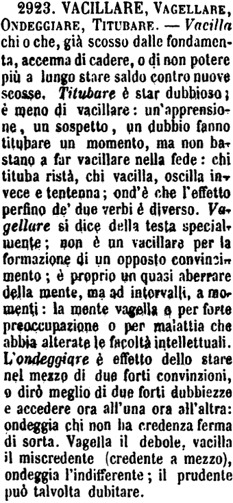 Vacillare, Vagellare, Ondeggiare, Titubare - Vacilla chi o che, già scosso dalle fondamenta, accenna di cadere, o di non potere più a lungo stare saldo contro nuove scosse. Titubare è star dubbioso; è meno di vacillare: un'apprensione, un sospetto, un dubbio fanno titubare un momento, ma non bastano a far vacillare nella fede: chi tituba ristà, chi vacilla, oscilla invece e tentenna; ond'è che l'effetto perfino de' due verbi è diverso. Vagellare si dice della testa specialmente; non è un vacillare per la formazione di un opposto convincimento; è proprio un quasi aberrare della mente, ma ad intervalli, a momenti: la mente vagella o per forte preoccupazione o per malattia che abbia alterate le facoltà intellettuali. L'ondeggiare è effetto dello stare nel mezzo di due forti convinzioni, o dirò meglio di due forti dubbiezze e accedere ora all'una ora all'altra: ondeggia chi non ha credenza ferma di sorta. Vagella il debole, vacilla il miscredente (credente a mezzo), ondeggia l'indifferente; il prudente può talvolta dubitare. [immagine]