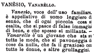 | Vanesio, Vanarello - Vanesio, voce dell'uso familiare, è appellativo di uomo leggiero di senno, che di ogni piccola cosa si esalta, che si pasce di false immagini di bene, e che spesso si millanta. - Vanarello è un giovane che sta su tutte le mode, che si pavoneggia di cose da nulla, che fa il grazioso con tutte le donne, e altre grullaggini. [immagine] |